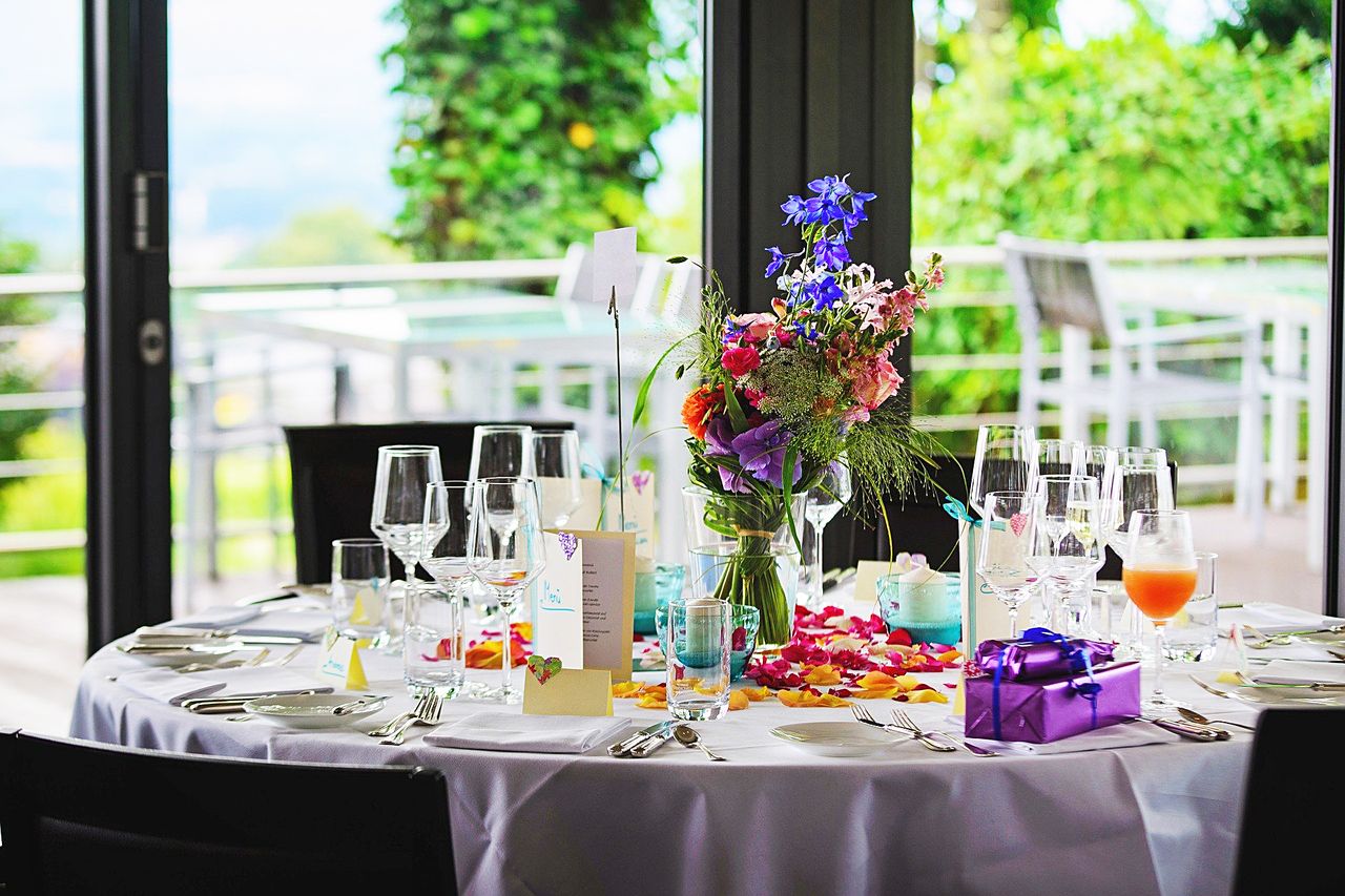 Sehr gut passt zu dieser runden Tischdecke eine farbenfrohe Deko oder ein bunter Blumenstrauss mittig auf dem Tisch.